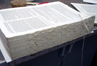 Large part of our business is rebinding Study Bibles. We use only genuine leather, and hand sew in new liners, ribbons, and headbands. We have over 20 colors of calf skin available, as well as imported Goat skin, and imported English Morrocco